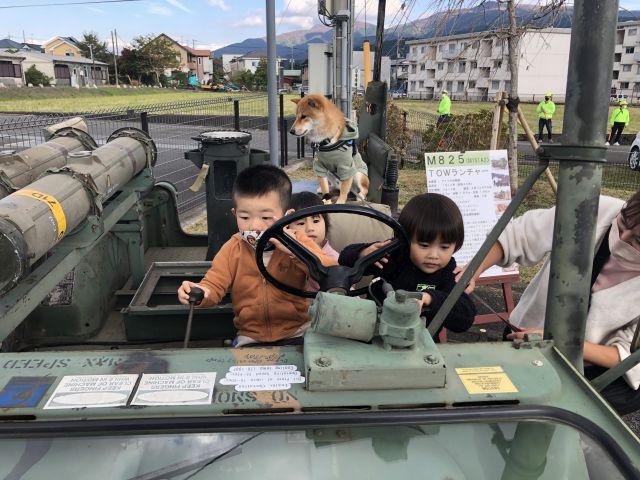 後方には写っているマンションは自衛隊官舎でして、土地柄軍用車両も違和感のない展示車両ということで大人気♬