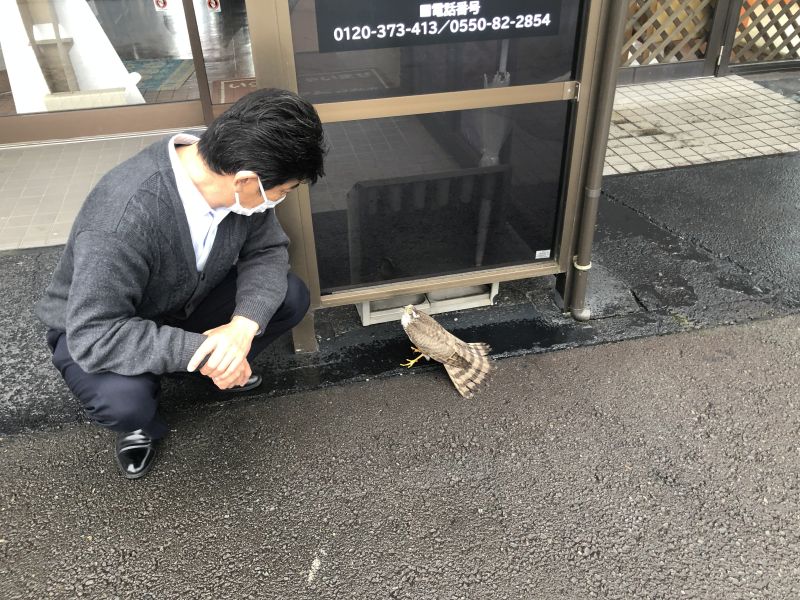 まだ幼鳥のようですが、格好いい嘴は猛禽類に間違いまりません!スズメは数か月に一回ガラスに激突して保護するので、しばらく放っておけば大丈夫でしょうと、様子を見ていたら数分後には元気舞い上がって行きました。