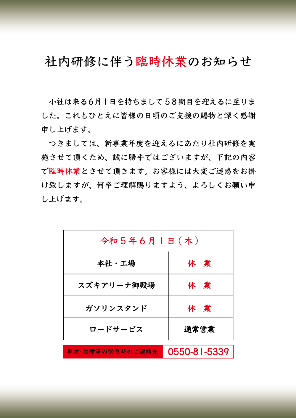 臨時休業のお知らせ