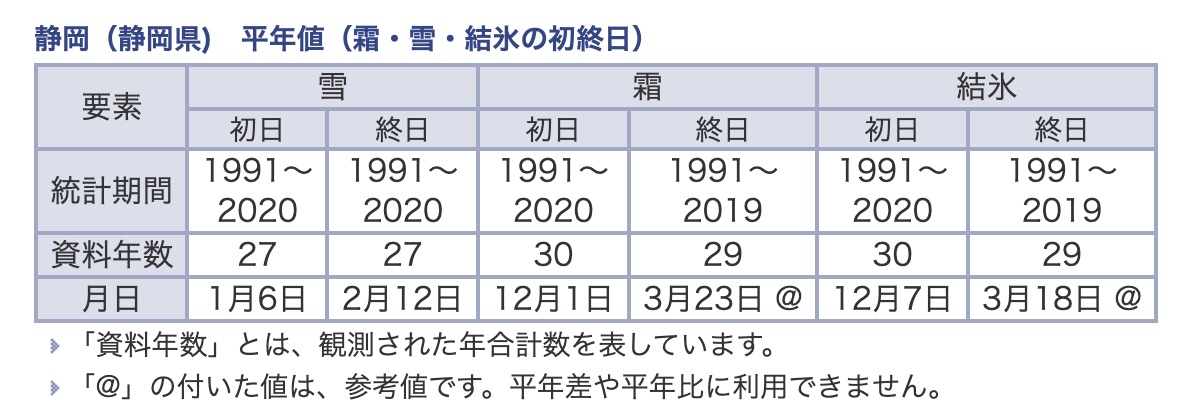 静岡県の初雪は過去約30年間で、平均して1月6日頃のようです。が、温暖な気候がウリの静岡県の平均値が(極東)御殿場に当てはまるかといえば、ちょっと違う気が…。