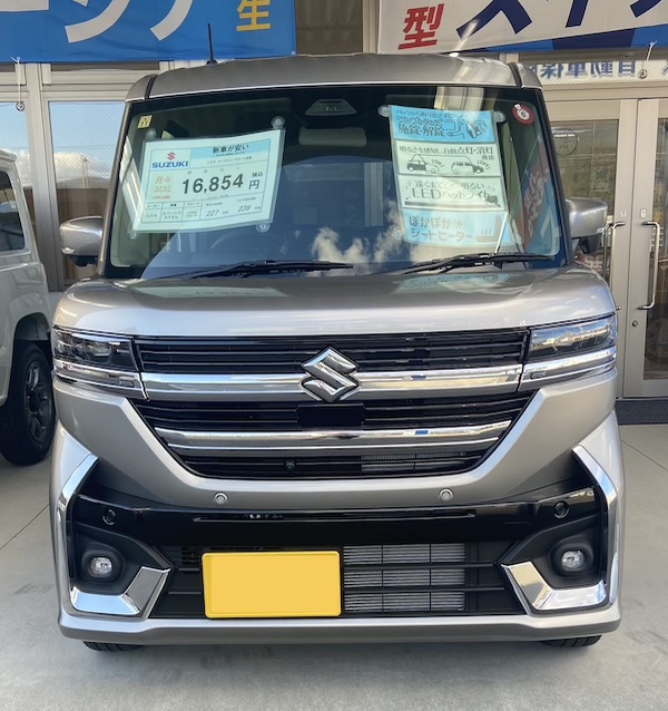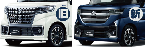 新型スペーシアカスタムは先代の大迫力メッキグリルから、上品な顔立ちに大きくモデルチェンジしましたねー。フォグランプ周りもデザイン一新!