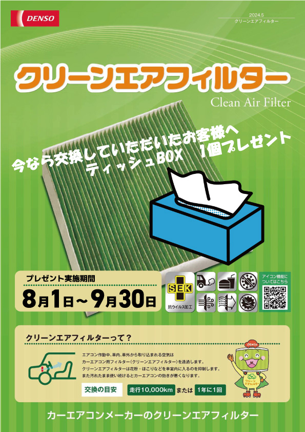 内容:期間中にエアコンフィルター交換をして頂いた方に、ティッシュBOX1箱プレゼント🎁